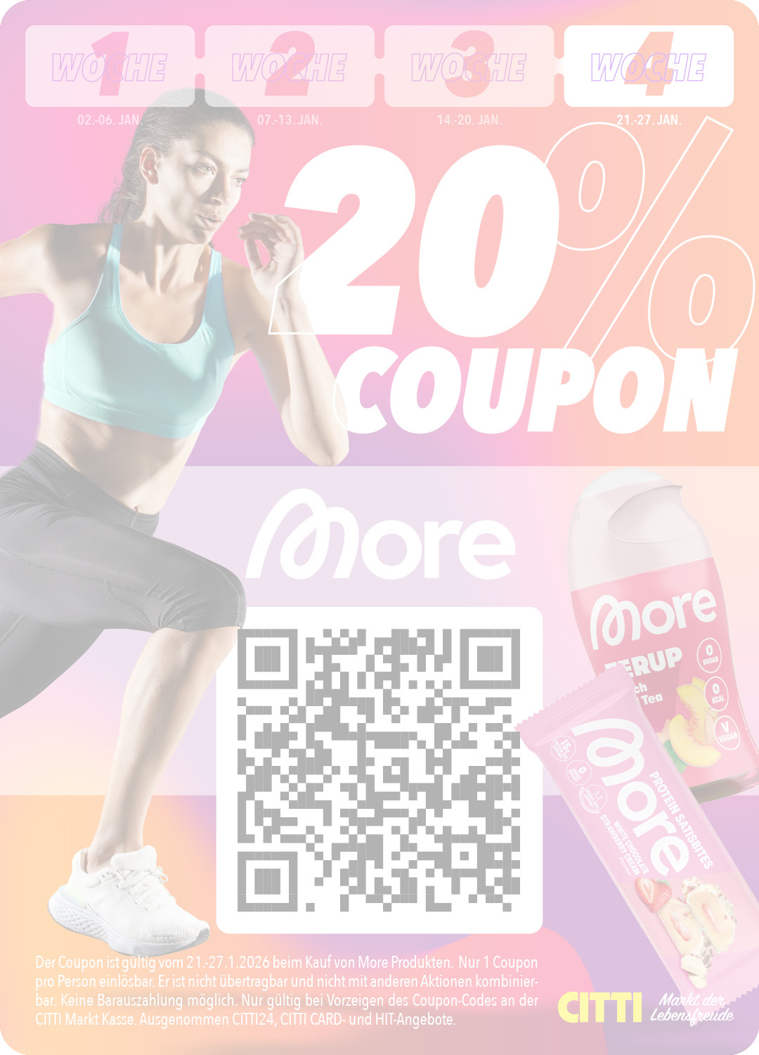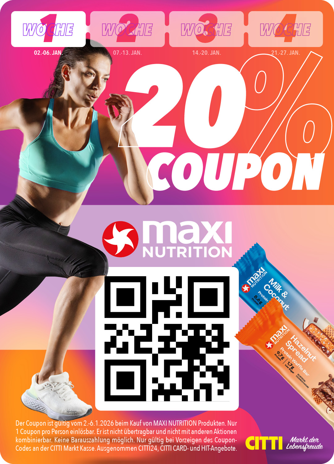 Die Coupons sind gültig vom 2.-27.1.2026 beim Kauf der jeweils auf dem Coupon angegebenen Warengrupe und/oder angegebenen Marken. Nur 1 Coupon pro Person einlösbar. Er ist nicht übertragbar und nicht mit anderen Aktionen kombinierbar. Keine Barauszahlung möglich. Nur gültig bei Vorzeigen des Coupon-Codes an der CITTI Markt Kasse. Ausgenommen CITTI24, CITTI CARD- und HIT-Angebote. Weitere Informationen entnehmen Sie bitte dem jeweiligem Coupon.