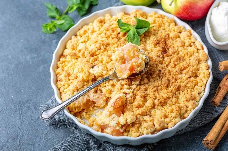 Den Apple Crumble warm servieren und mit einer Kugel Vanilleeis garnieren.